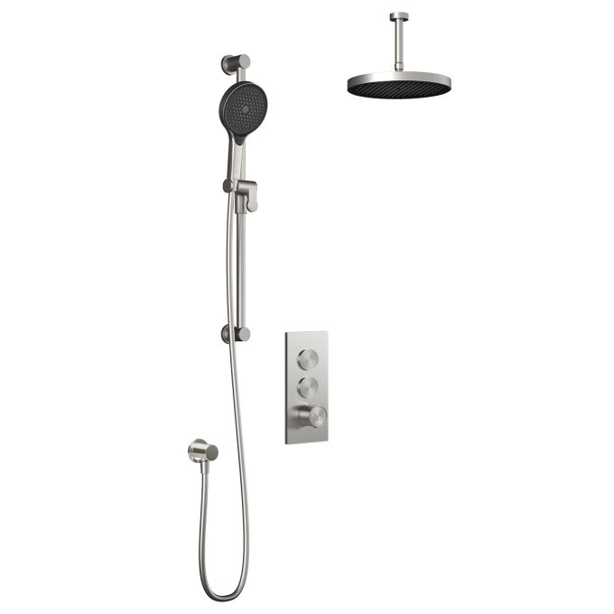 Shower system with: 2-Way AQUATONIK™ Type T/P ½'' rough push-button thermostatic valve - Chrome and matte black